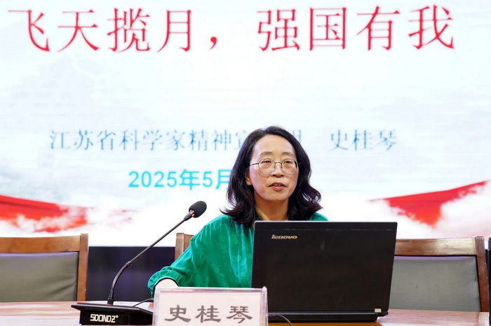 江苏省科学家精神宣讲团成员史桂琴老师以《仰望星空育桃李脚踏实地筑未来》为题,深情讲述了“嫦娥之父”叶培建院士的感人事迹。通过“100减1等于0”的航天标准、“责任比命大”的担当故事,生动诠释了爱国、创新、求实、奉献的科学家精神。同学们听得全神贯注,不时爆发出热烈的掌声。