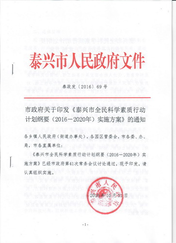 10月31日,泰兴市人民政府以泰政发[2016]69号文件的形式下发了《泰兴市全民科学素质行动计划纲要(2016-2020年)实施方案》(以下简称:《方案》)。